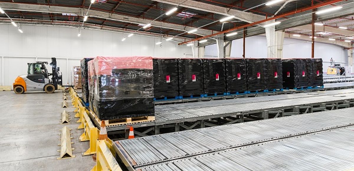 At the end of the production line, automated guided vehicles (AGVs) transport pallets weighing up to 1,200 kg to the railway loading platforms. These ultra-modern AGVs can move two pallets at once. This is where Interroll's solution comes into play. Accurate to the nearest millimeter, the AGVs place the pallets of water bottles onto heavy-duty gravity conveyors. Sixteen lanes, holding up to 27 pallets, can easily handle the pace. The gravity lanes direct the pallets to the forklift trucks which pick these up four by four to be loaded onto waiting trains. Despite its apparent simplicity, this solution boasts advanced technologies and Interroll's extensive expertise. Firstly, to ensure the safety of the installation, operators and goods, Interroll's MSC 80 Magnetic Speed Control rollers maintain a constant pallet speed of 0.3 meters per second. At the end of the line, and for enhanced operator safety and comfort, a mechanical separation solution enables four pallets to be picked up simultaneously for efficient loading.